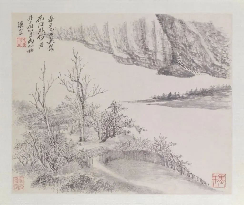第四开:自识:“春事已云莫,落花门外无。何为井上树,四月尚如枯。渔山子。”钤“渔山”、“墨井”朱文印二方。