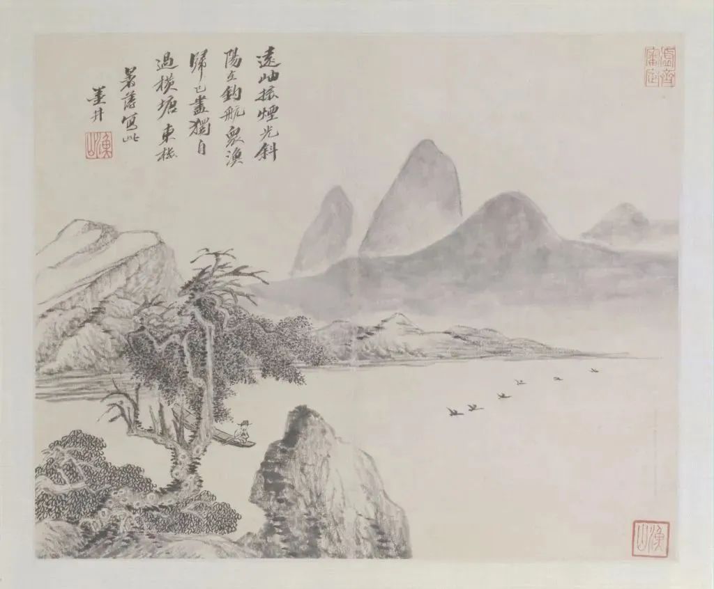 第二开:自识:“远岫接烟光,斜阳在钓航。众渔归已尽,独自过横塘。东楼暑薄写此。墨井。”钤“渔山”朱文印二方。