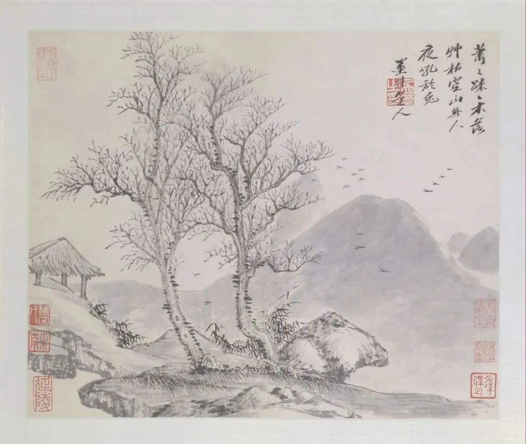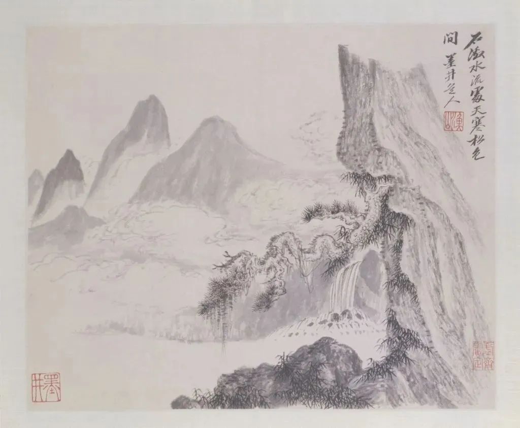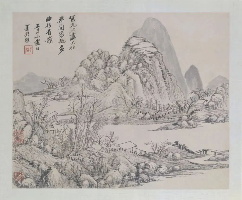 第八开:自识:“石激水流处,天寒松色间。墨井道人。”钤“渔山”、“墨井” 朱文印二方。