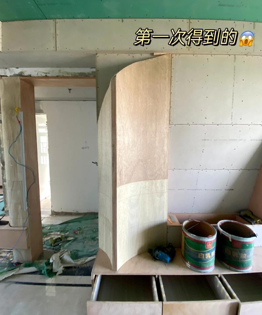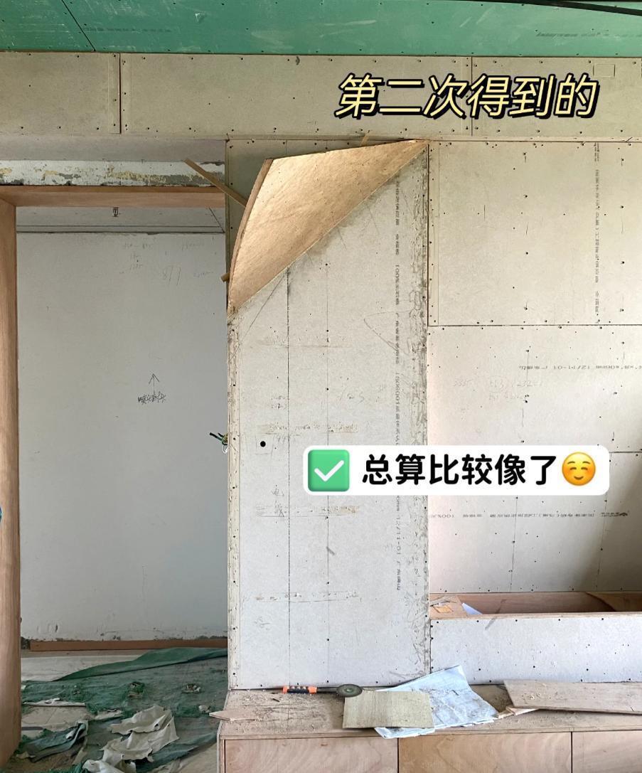 比如网友@EASYSD,看上了翻页造型的背景墙,又因为自家背景墙结构与网图差不多,所以就想做同款,让家里多些艺术氛围。由于没有图纸也没有详细尺寸,全凭木工经验操作,结果第一次就翻车了。第二次拆掉下方多余的弧形造型后总算有点像样了,但翻页弧度那里还是不太自然。第三次在木工和油工师傅多次努力下终于把造型做出来了,可最后整体效果却不尽如人意,配上地面土得掉渣的地砖拼花后,给人一种四不像的感觉。